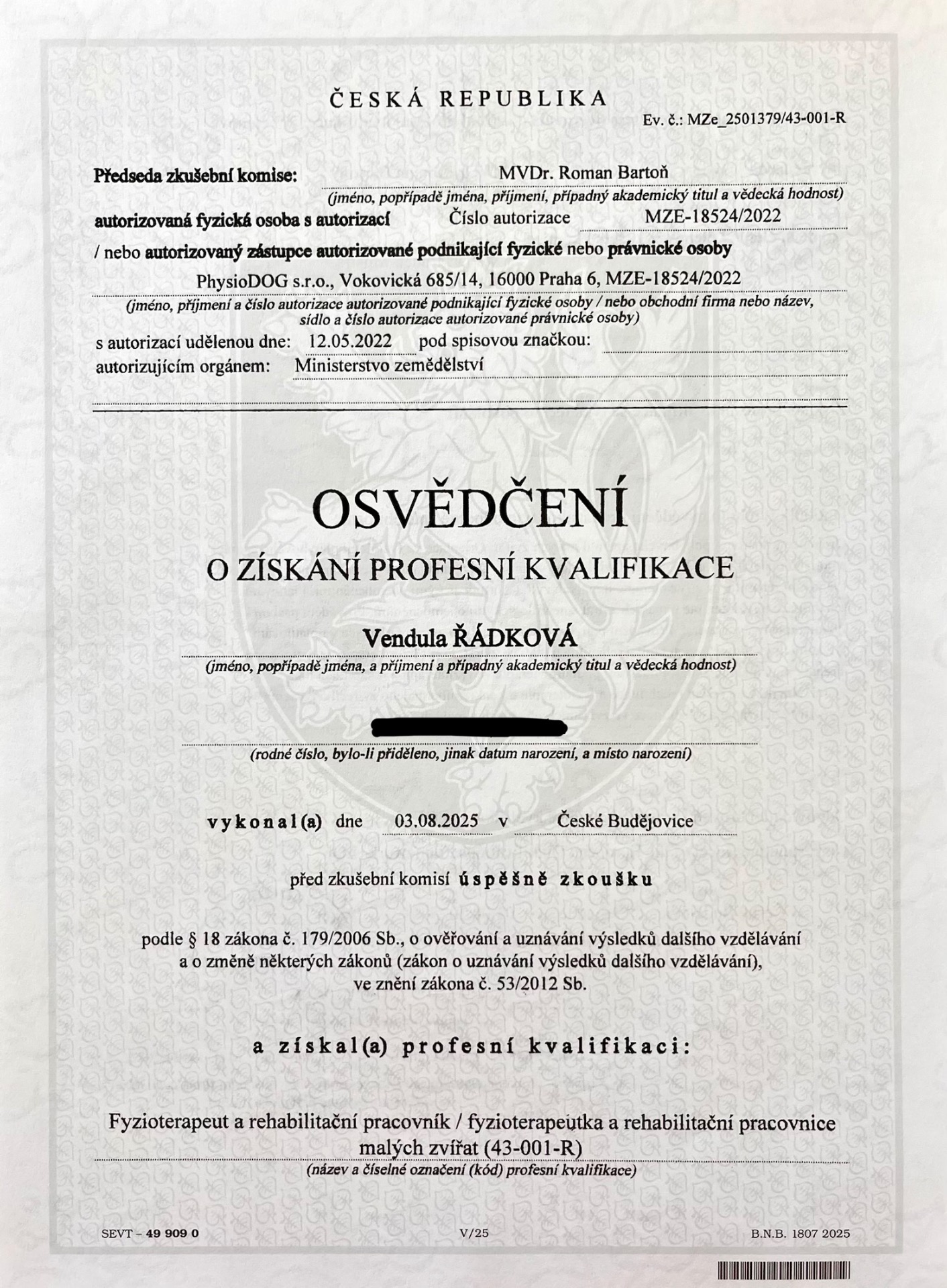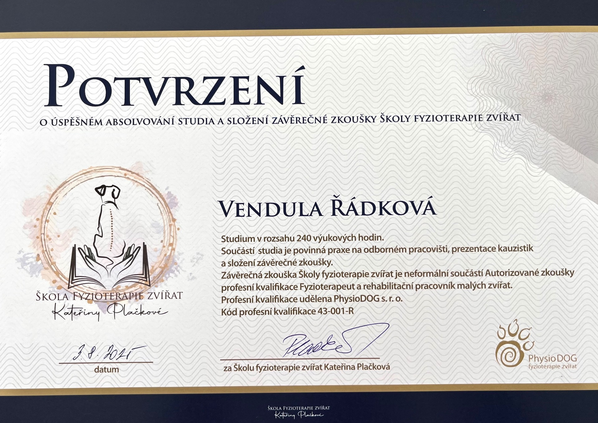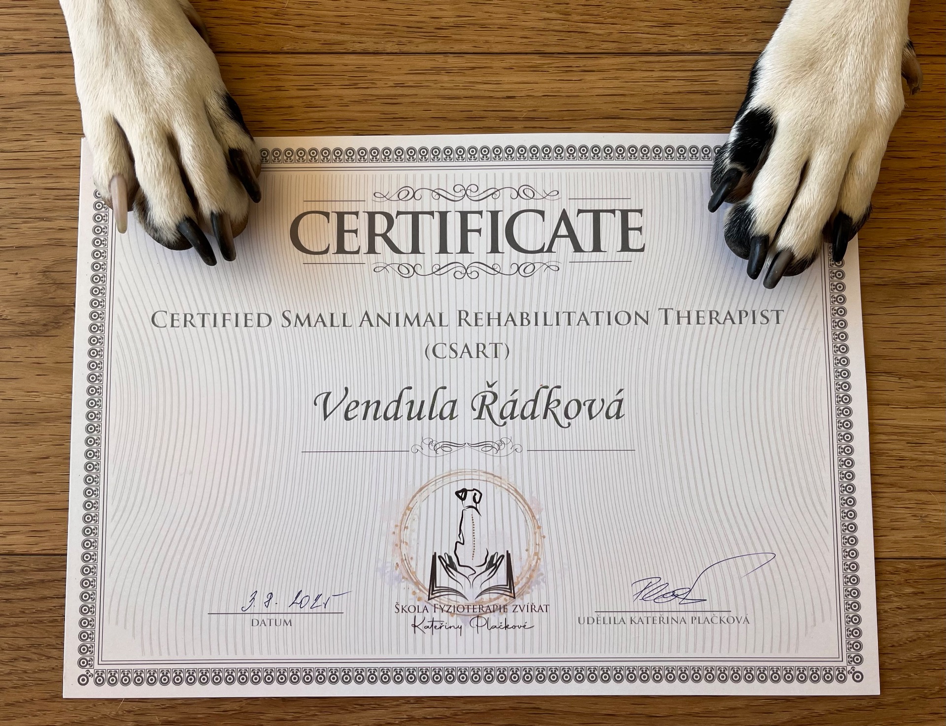 O fyzioterapii se zajímám od roku 2019. Přivedl mě k ní můj dalmatin Dex, se kterým jsme vyzkoušeli různé psí sporty, ale nejvíc si zamilovali individuální mushing. Právě při trénincích jsem začala víc přemýšlet o fungování pohybového aparátu, regeneraci a možných následcích tohoto sportu. A tehdy jsem pochopila, že toto je ten směr, kterým chci v životě jít. Od té doby jsem absolvovala řadu odborných seminářů a workshopů, stáž ve PhysioDOG, působila v jedné fyzioterapeutické ordinaci a dokončila Školu fyzioterapie zvířat Kateřiny Plačkové. Tu jsem zakončila náročnou několikadenní zkouškou před komisí složenou z veterinárních kapacit, jako jsou MVDr. Musil či MVDr. Bartoň. Získala jsem tak profesní kvalifikaci Fyzioterapeut a rehabilitační pracovník malých zvířat a zároveň titul CSART (Certified Small Animal Rehabilitation Therapist).